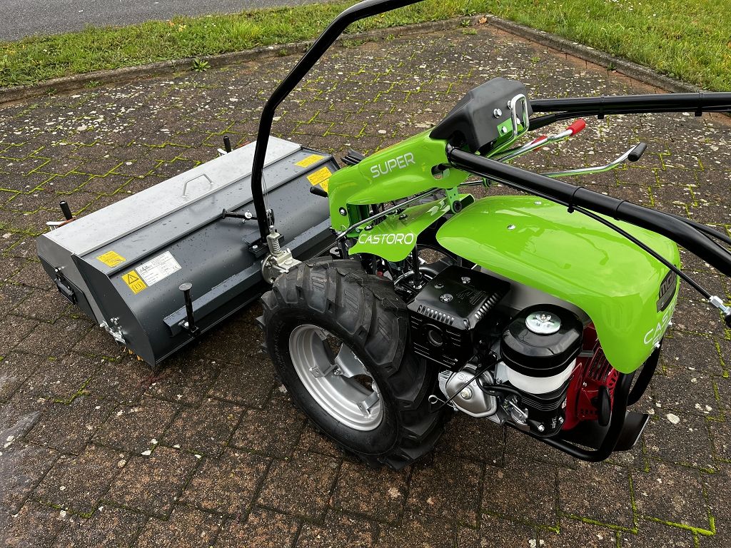 13 le-s Castoro Super HONDA egytengelyes kistraktor gyűjtőtartályos seprőgéppel