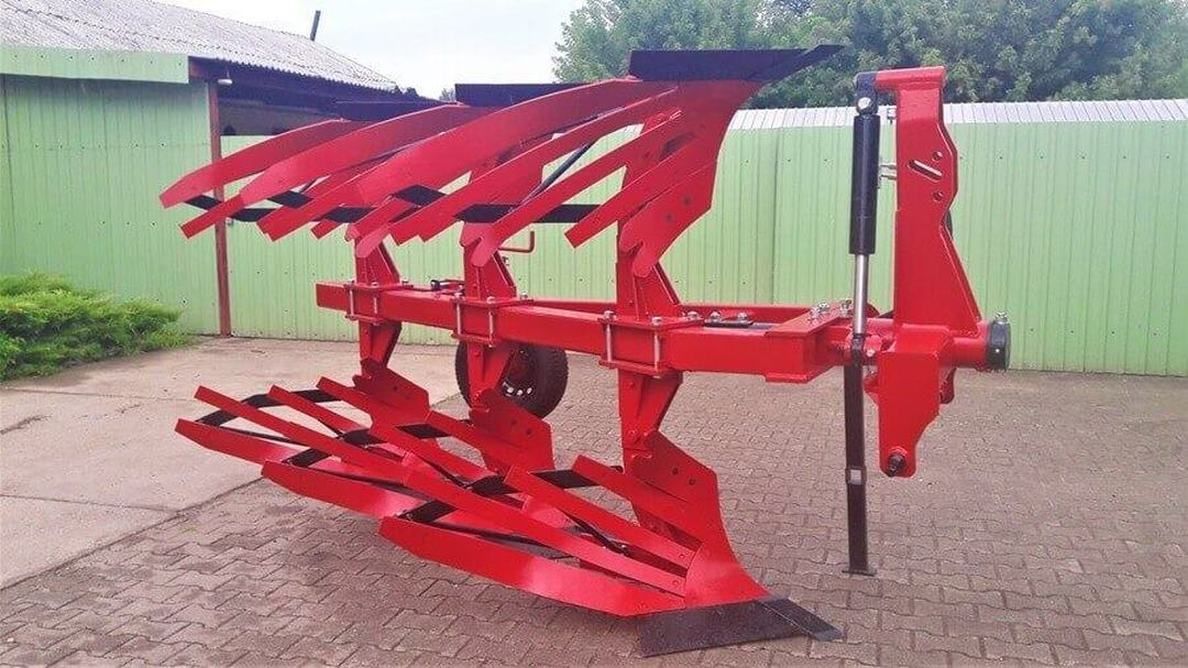 A képen látható új Csólyos 3 fejes váltva forgató eke réselt kormánylemezzel (magyar gyártmányú).