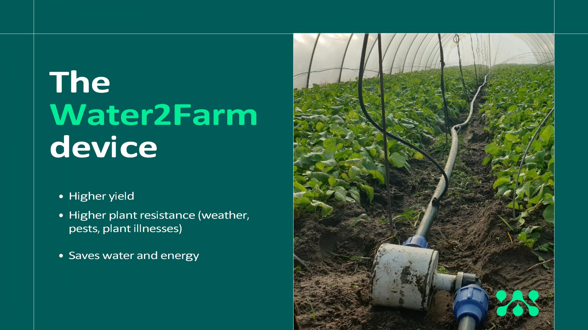 A Water2Farm egy magyar fejlesztésű öntözővíz-kezelő és intelligens agrotech rendszer. Segítségünkkel akár 18 %-kal kevesebb víz felhasználásával érhetsz el minden eddiginél nagyobb hozamot.